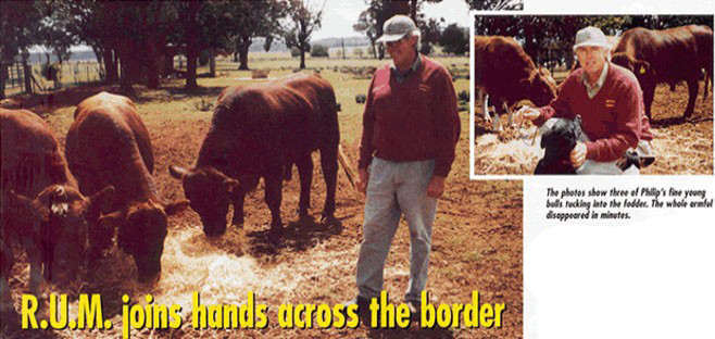 They say it pays to advertise. Or at least to appear in this newsletter. Thus, when Philip Cooper of 'Mirridong', Cudal, NSW, read last season's edition, he saw the solution to a problem. The drought in NSW had a drastic impact on available feed for Philip's elite cattle herd and, reading that Barry Lutze of SA had sown his barley crop with R.U.M., he saw the opportunity to lay his hands on some quality fodder. A quick call to local R.U.M. distributor Geoff Doberersoon set up a chain of supply from SA's Yorke Peninsula to NSW. In SA, Bazz baled the straw from his premium malting barley crop and, in short order, 5 large shipments headed over the border to 'Mirridong'. "Being a fellow R.U.M. user, I knew the straw would be top quality. The cattle are doing really well on it", Philip said. "But even when the drought ends, the feed shortage will be with us for some time so this could be an ongoing arrangement." For his part, Bazz reckoned that all his R.U.M. mates in SA will be more than happy to bale their high quality barley straw! The photos show three of Philip's fine young bulls tucking into the fodder. The whole armful disappeared in minutes.